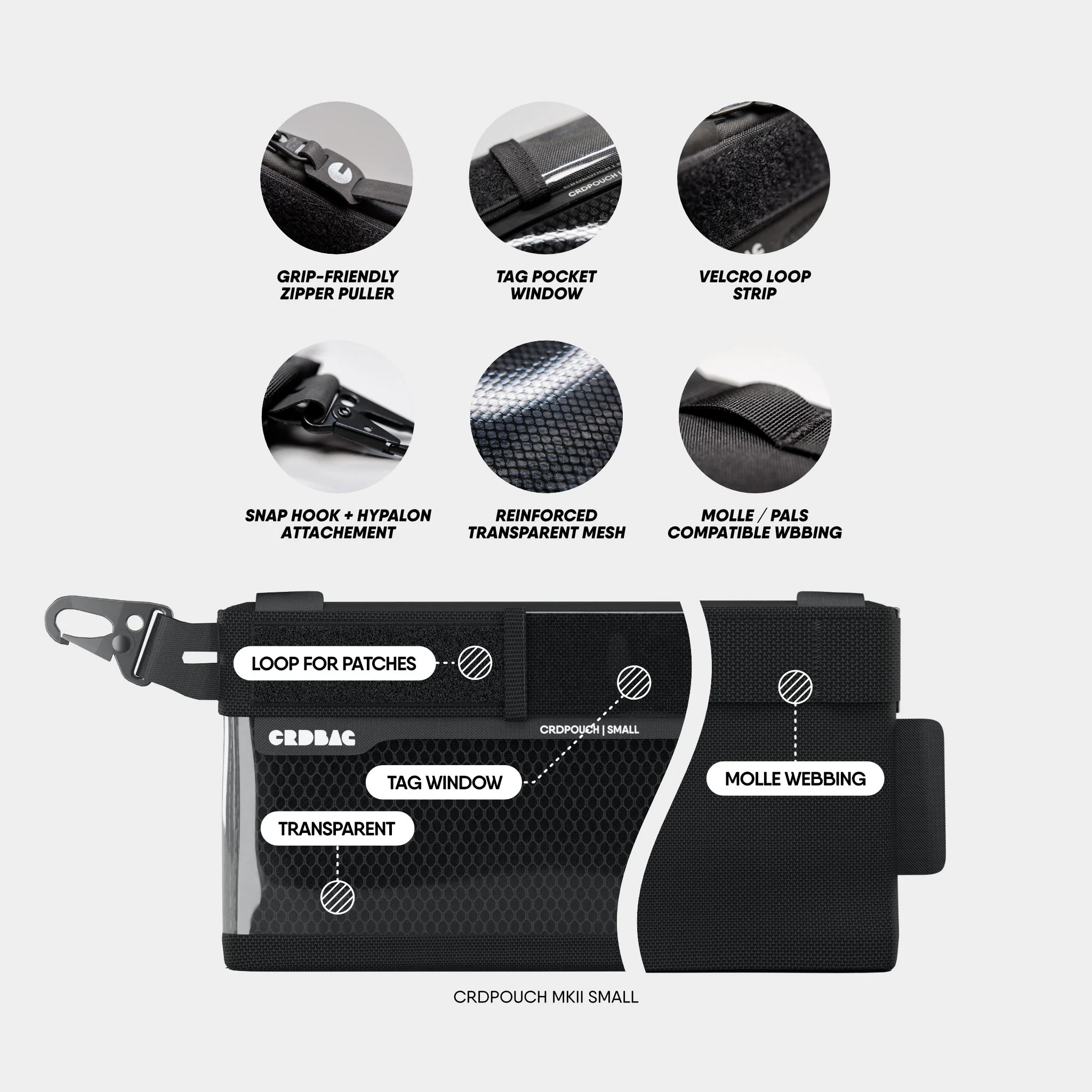 Clear mesh window with crease-proof 0.8mil TPU. Velcro panel on the front and hypalon side label for custom stitching. MOLLE/PALS-compatible webbing on the back for diverse attachment possibilities.